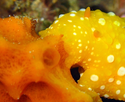 Here are photos of two different specimens of Phyllidia flava (if I'm not wrong). As far as I know, these slugs are found on sponges of Axinella sp. or Acanthella sp. These animals are mostly found in Middle and North Agean waters around Turkish coasts. The northern part is rich in Axinella and Acanthella species, but they are rarely seen in the shallow waters of Middle Agean. In these regions P. flava prefer another type of sponge. They are always orange in colour if they are found on Axinella or Acanthella, but always yellow in colour, if found on this yellow sponge. I would like to know if these animals use the pigments of the sponge they eat, and is it possible for them to change their colour if the food is changed? I will also be pleased if someone identify this yellow sponge.
