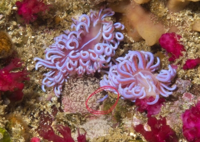 I attach a picture of said Phyllodesmium horridum on the fan Acabaria rubra -- I think feeding but am not sure.
