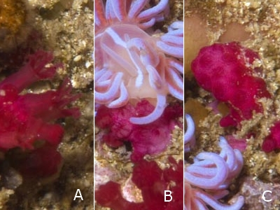 There is another interesting subject in your photo. Scattered around are small red patches of some cnidarian, presumably an octocoral of some sort. In the photomontage alongside, I show three parts of your photo in more detail. In A, softcoral animals [the polyps] are fully extended while in C, they are fully retracted. In the middle photo [B] I am pretty sure the nudibranch is feeding on the colony and the polyps are semi-retracted. You will see the red colour in the digestive gland ducts of the cerata matches the red of the soft coral very well.Gosliner reports that this species feeds on the gorgonian Melitodes. On first sight this doesn't look very gorgonian-like to me but I don't know anything about Sth African cnidarians. If anyone can identify the cnidarian in these photos it would be a useful contribution