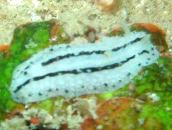 I photographed these Phyllidiopsis phiphiensis in the Mergui Archipelago, Andaman Sea, Myanmar. The upper image was shot at Western Rocky on Feb. 25, 2003 at about 10 meters. It appears to be feeding on a red sponge. It was 16 mm long. The slug in the lower image, also on