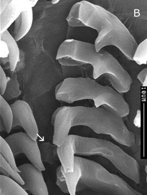 PHOTO B: Central region at the old, worn end of the radula showing worn central tooth (arrow) and broken cuspless teeth 1.