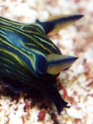 on the notum and both sides of the body. Some of the lines are lighter in shade and can be continuous or broken. Pola et al describe the body surface as 'strongly wrinkled'. The edge of the foot is blue-black. The head is rounded with a pair of conical, completely retractile, perfoliate rhinophores