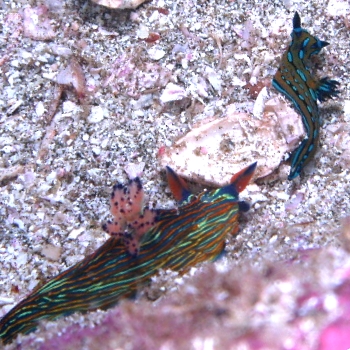 In all this range, we have two of their preferred prey: Tambja abdere and Tambja eliora. They seem to like T. eliora more, since I have seen them spit out T. abdere more often than not. Now, T. eliora also has the swimming response observed by Graham in Tambja morosa, and I have seen it do so as soon as the Roboastra touches it. I have not seen it react to the mucus trail as Tambja morosa does, but it is certainly an interesting notion. I think this series of photos illustrates the escape response (attempt) of T. eliora to an attack by R. leonis.