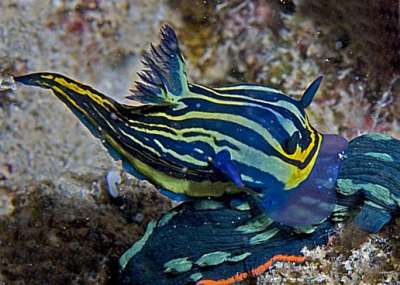 Please help identify the nudi in the attached photo. This guy was just moving along the bottom real fast. The funny thing is that a few of us (including myself) swore that the stripes were bright yellow, while others saw green, and the photo shows something in between. Thanks very much.