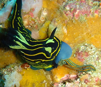 As I say at the top of the page I am not sure if this animal, which Debelius records from South Africa as T. luteolineata is really correctly identified or not. Typical R. luteolineata have a pattern of green markings which are absent in these South African animals. Perhaps it is a regional colour variation. It certainly has the prominent blue oral lappets typical of a species of Roboastra. As I say at the top of the page, Eliot's Nembrotha affinis has yet to be rediscovered.