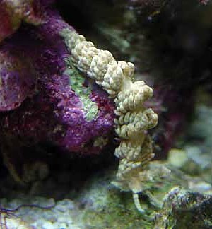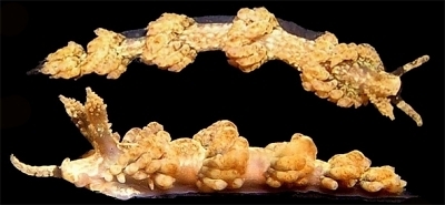 Colin Redfern's observations confirm that the body is brownish, although with heavy white pigmentation on the dorsum, and that the rhinophores, as described by Marcus & Marcus (1970), are 'beset with tubercles'. As noted by Edmunds & Just (1983), and Redfern, the cerata rock from side to side when the animal is in motion, in a very distinctive movement. It also appears that the brown background colour is caused by zooxanthellae in ducts of the digestive gland, ramifying through the body wall [see reply to Colin Redferns's message.]