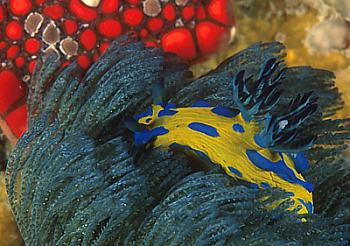 This animal is related to Nembrotha, but while species of that genus feed on ascidians, your animal is Tambja verconis which feeds on bryozoans. In the close up alongside you will see some blue plant-like growths at the top left. They are small branches of the bryozoan Bugula dentata which T. verconis eats. As you will see from the Fact Sheet and attached messages, this species is found around southern Australia and northern New Zealand. On the east coast of Australia it has been found as far north as Port Stephens, but as it is dependent on Bugula for its food, its is never a permanent resident anywhere, its presence being controlled by the irregular appearance and disappearance of its food.