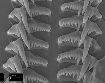 Upper: CASIZ 172861, Bali, Indonesia, 3 mm. Photo: T. Gosliner. Lower: CASIZ 172861. Radular morphology. Scale =10 µm. [From Gosliner & Fahey 2008: Fig 20C].