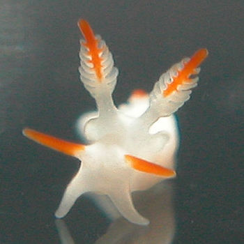 In my earlier discussion I should have mentioned Trapania sp. 8. Is it just another colour form of one species? It has orange rhinophores, oral tentacles, tentacular foot corners, extra-rhinophoral and extra-branchial processes and a large orange line on the posterior tip of the foot. The gills are white. The orange on the extra-rhinophoral and extra-branchial processes differs from what we see in T. aurata in that the orange pigment covers the whole of the process, not just a dorsal line.